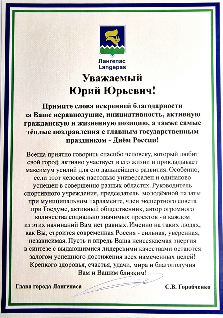 Член Молодежного парламента при Думе Югры Юрий Кожевников получил благодарность от главы города Лангепаса Сергея Горобченко за свою работу и общественную деятельность на благо города, округа и страны. Награждение прошло в рамках празднования Дня России.