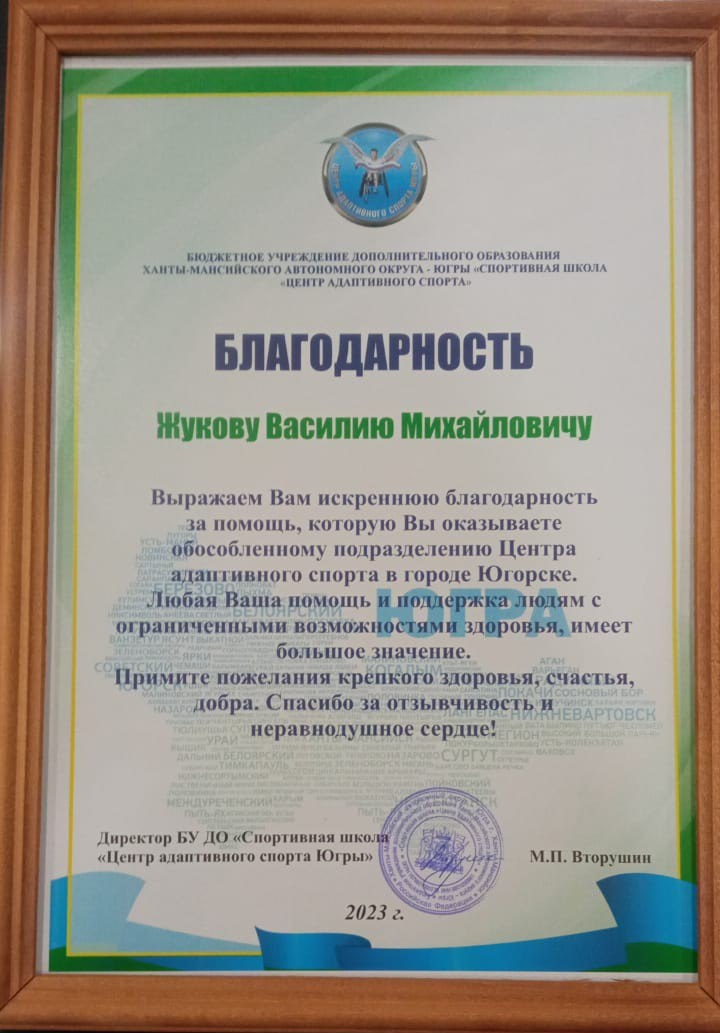 На имя депутата Думы Югры, члена фракции КПРФ Василия Жукова поступила благодарность от спортивной школы «Центр адаптивного спорта Югры» города Югорска.