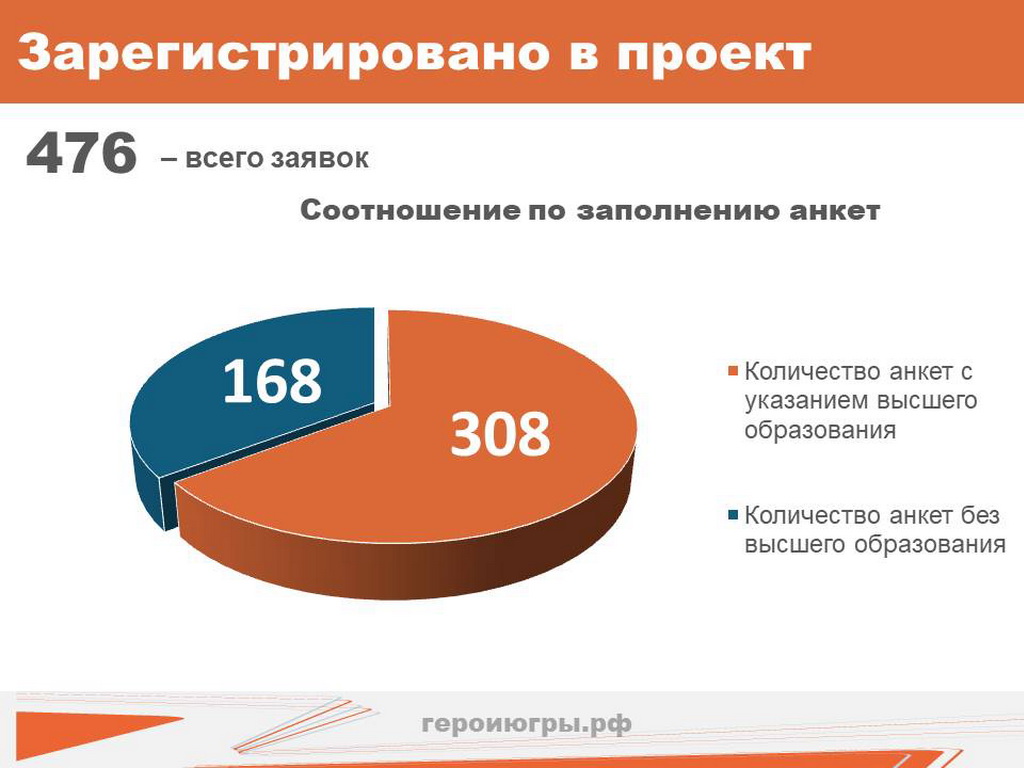 Всего от участников СВО с 25 декабря 2024 года по 1 февраля 2025 года поступило 476 заявок, из них от 308 кандидатов – с высшим образованием. Лидируют Ханты-Мансийск, Сургут, Нижневартовск. Есть среди заявившихся на участие в проекте 4 женщины. До 10 марта пройдет зачисление, затем начнется обучение.