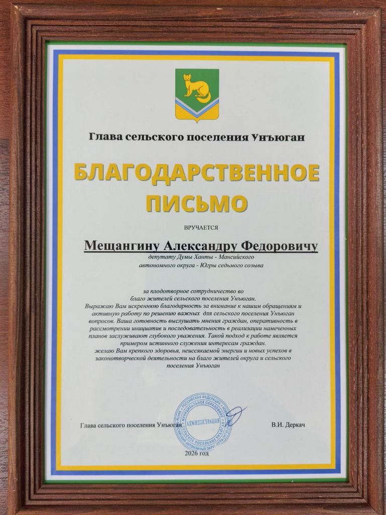 В сельском поселении Унъюган Октябрьского района депутату Александру Мещангину вручили Благодарственное письмо за плодотворное сотрудничество и активную деятельность во благо жителей территории.