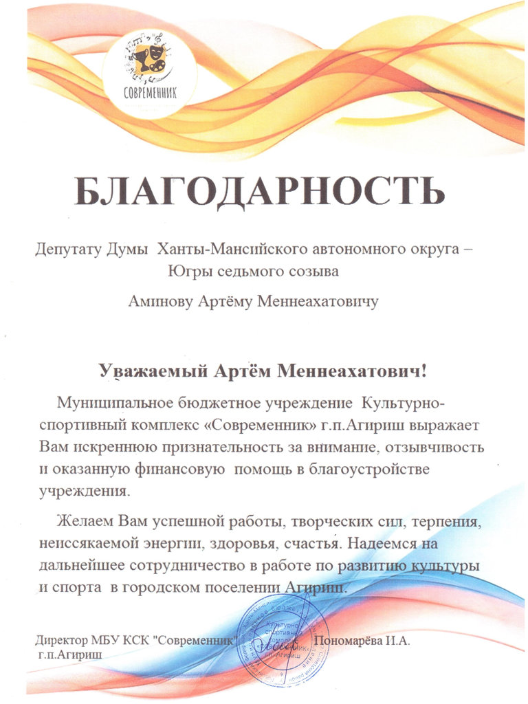 Руководство Культурно-спортивного комплекса «Современник» городского поселения Агириш Советского района выразило благодарность депутату Думы Югры, члену фракции КПРФ Артёму Аминову за финансовую помощь, оказываемую учреждению.